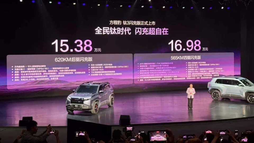 方程豹钛3闪充版在3月13日正式上市,一共给到了2个版本,后驱版15.38万元,四驱版16.98万元。如果对比2025年推出的车型,后驱版相比老款顶配价格上涨4000元,四驱版则是相比老款顶配降价8000元。而除此之外,钛7闪充版也开启了预售,价格数字是22-25万元。