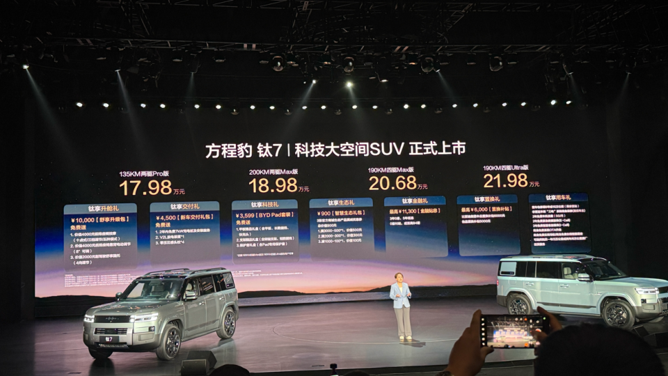 预售的方程豹钛7也是类似,本身纯电方盒子SUV的市场不大,就没有太多对手。其次是,2025年其曾经搞出过一次价格上的惊天大逆转,原本预计25万元左右起售,再到20万元左右起售,最终真实的起售价格来到17.98万元。钛7的闪充纯电版本能否给到这样的反击,也是一大看点。