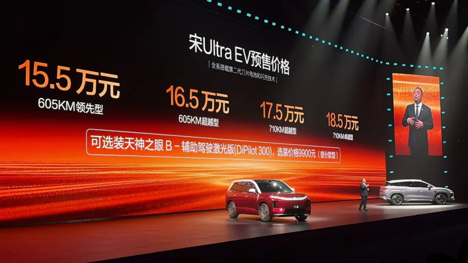 宋Ultra进行预售,预售15.5-18.5万元,4个版本之间各相差1万元,16万的预算有605公里续航,17万多的预算就能有710公里续航。有高阶智驾、有城区辅助、可以选装激光雷达、有前备箱,还有兆瓦闪充。而这些配置和续航出现之后,它已经反超了同价位里的性价比屠夫-零跑C10和C11。